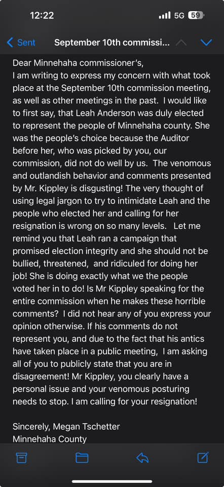 The September 10th Minnehaha County Commission meeting was filled with more contentious exchanges and hostile rhetoric, mostly coming from Joe Kippley. Auditor Anderson was requested by Kippley to bring an update on the 2020 election records after the press release detailing unreconcilable audit logs and an apparent algorithm in the absentee data. She did as requested and repeatedly said that the discrepancy is still there, it hasn’t been resolved. If you haven’t seen this one yet, click below.