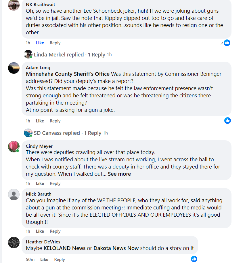 As you can see, the people don’t find the humor in it. What would happen to us if we walked into the State Capitol and stood next to Lee Schoenbeck exclaiming we wished we would have brought our shotguns? What would happen if we said to the Sheriff in a commission meeting “Can I borrow your gun?” We all know we’d be in handcuffs in two seconds and asked questions later.
