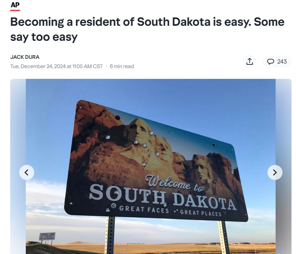 And at least one state has gotten wind that its residents might be avoiding high income taxes with easy South Dakota residency and is investigating.