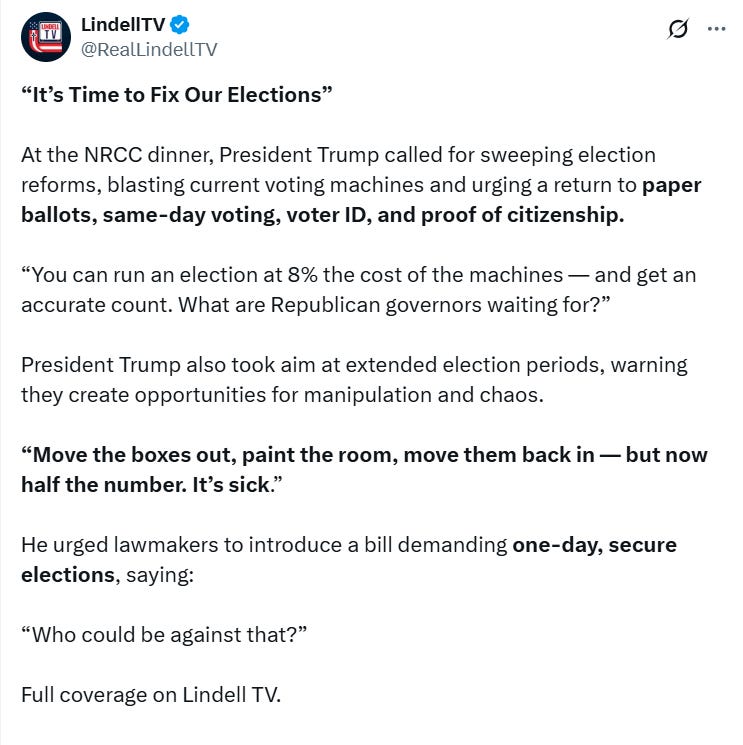 President Trump also doubled down on his calls for sweeping election reforms at the NRCC dinner.