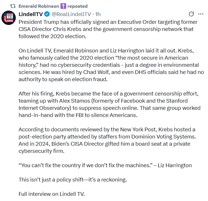 Yesterday, President Trump signed an executive order revoking former head of CISA Chris Kreb’s security clearance, and ordered DHS and the DOJ to investigate CISA’s unlawful activities surrounding the 2020 election and the censorship that ensued.