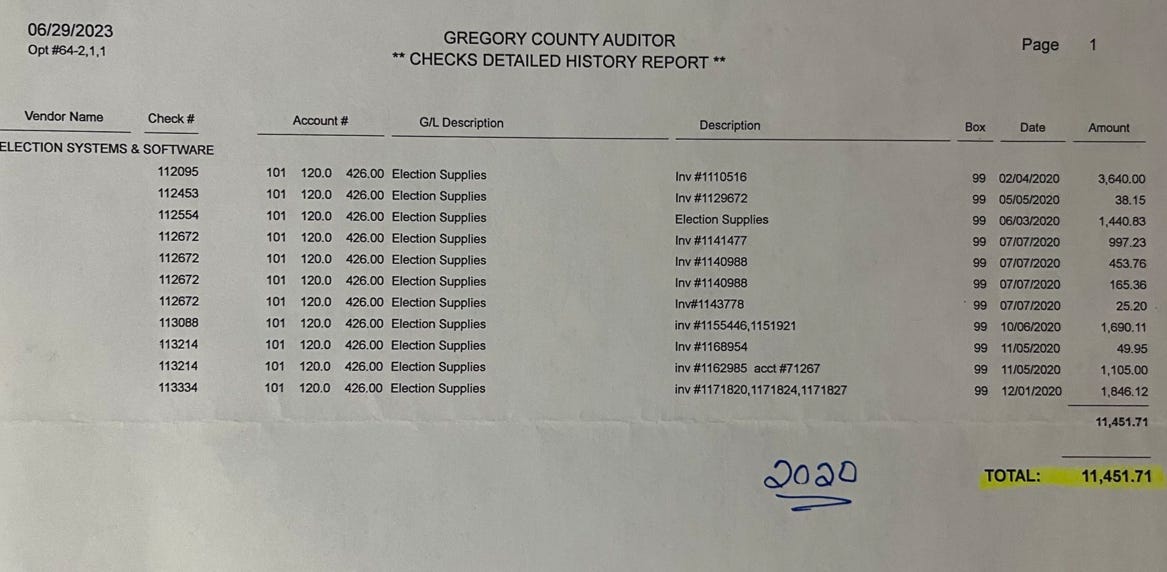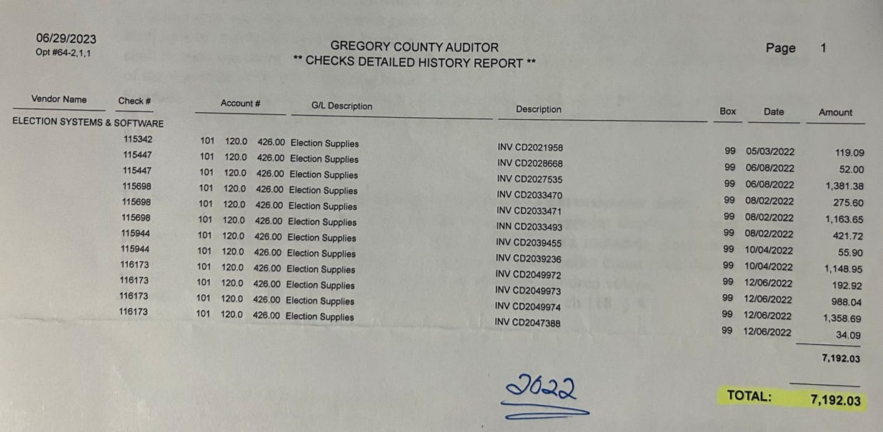 Julie Bartling claims it costs less than $2,000/election to use the tabulators in Gregory County, however, these documents obtained by citizens show invoices paid to ES&S amounted to $7,192.03 for 2022 and $11,451.71 for 2020.