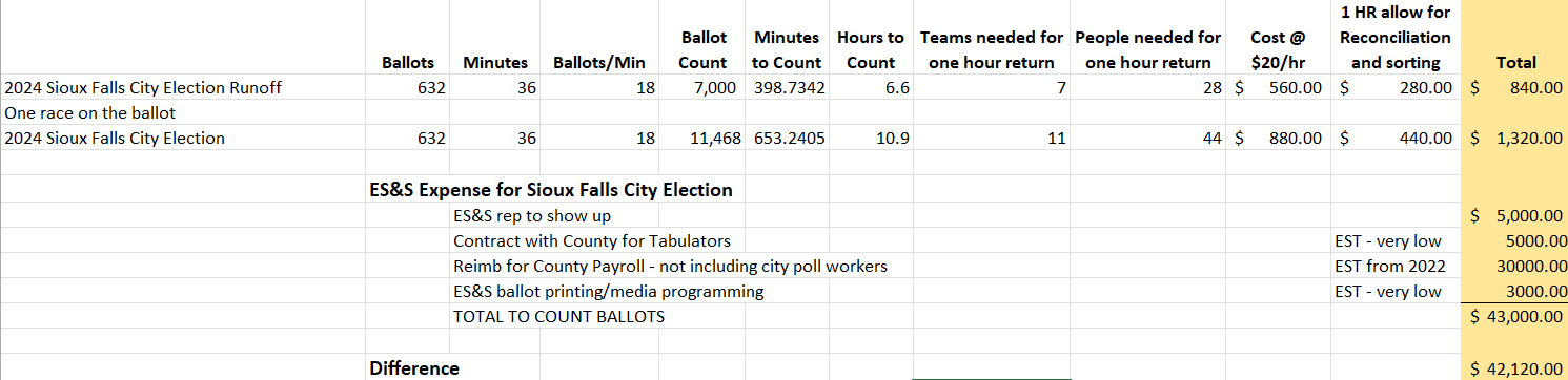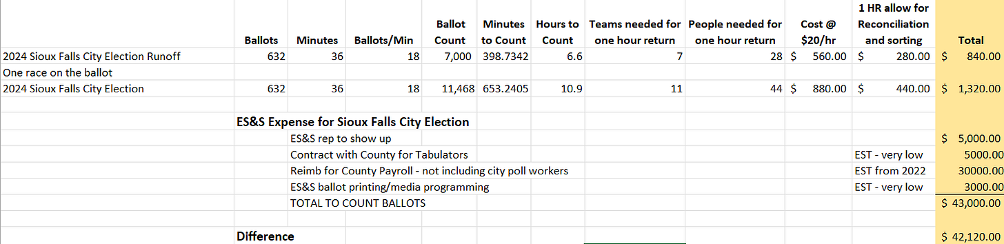 We estimate the City of Sioux Falls spent at least $43,000 on the election just to contract for ballot tabulating services, which is likely to be significantly more than that. Our estimate of counting one race on the ballot, at 18/min for 11,468 ballots would have taken 44 people one hour to count, 22 people two hours to count, and we threw in an extra hour for ballot sorting and reconciliation time for a total cost of $1,320.00.