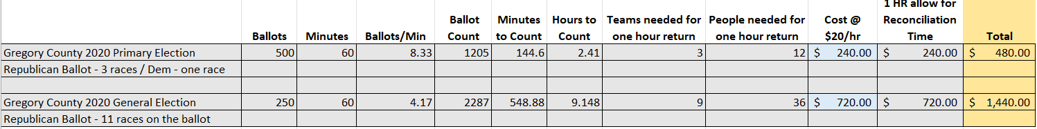 Gregory County Auditor claims it will cost $8,000 to hand count, we estimate anywhere between $480 - 800 using our methods and tally sheets. That is a HUGE DIFFERENCE.