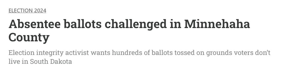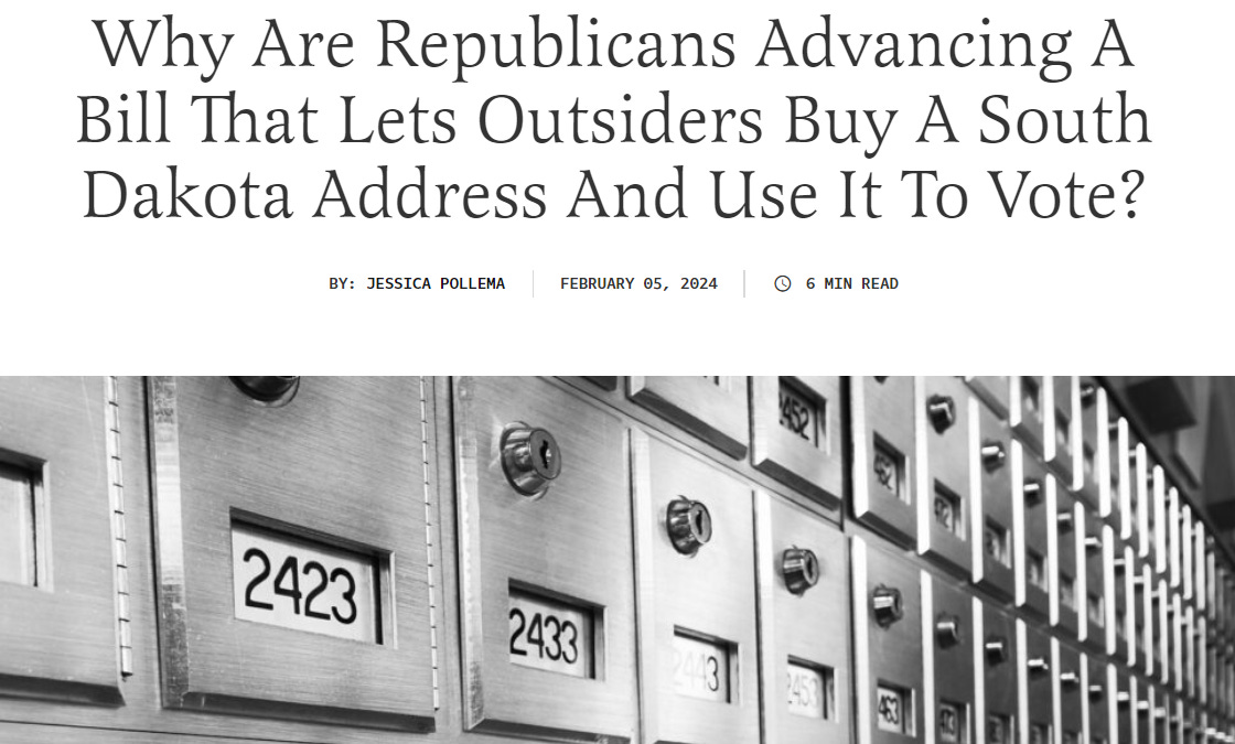 This article needs to be sent to every County Commission, auditor and State's Attorney. This is election fraud and they do not want to address it. We need to get the word out...by any means possible to the general public. Just look at what will be on the ballot in November....we do not need people who live in mail boxes, making our decisions for us...... People who live on the road, they just need to drive to South Dakota to vote........and maybe even spend some money instead of just sending an absentee ballot. Yes, Class Action Law suits are needed.