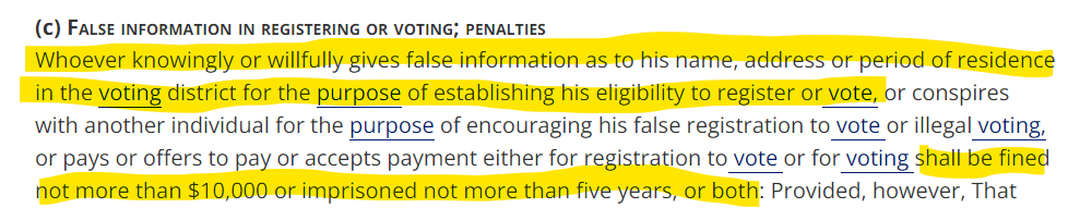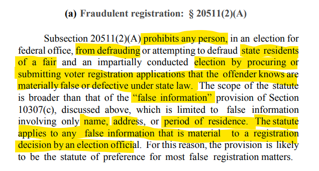 j. 52 USC §§ 10307(c), 20511(2) A person who provides false information concerning a person’s name, address, or period of residence in a voting district to establish voting eligibility commits election fraud. (emphasis added) It is clear the Federal government requires accurate and truthful information as to a voters address and residency for purposes of voting and considers a voters address as part of information identifying a voter.