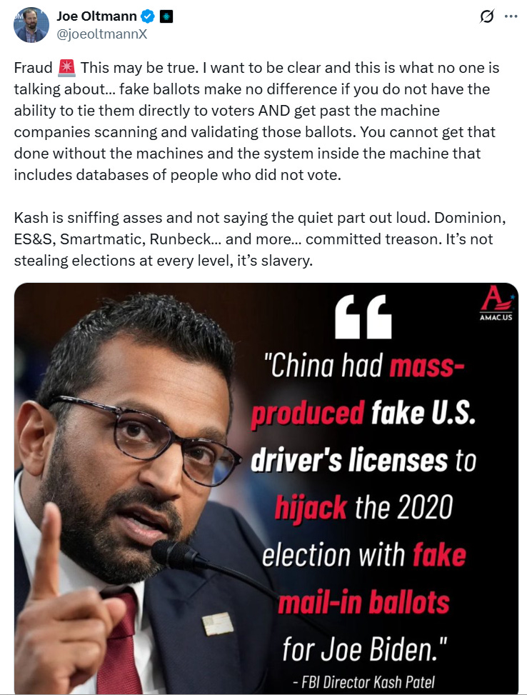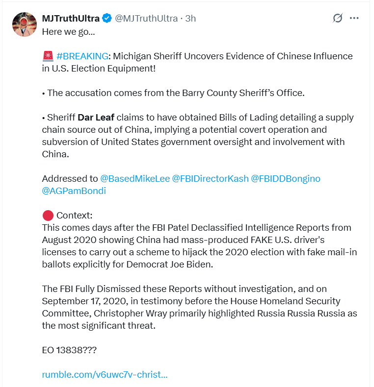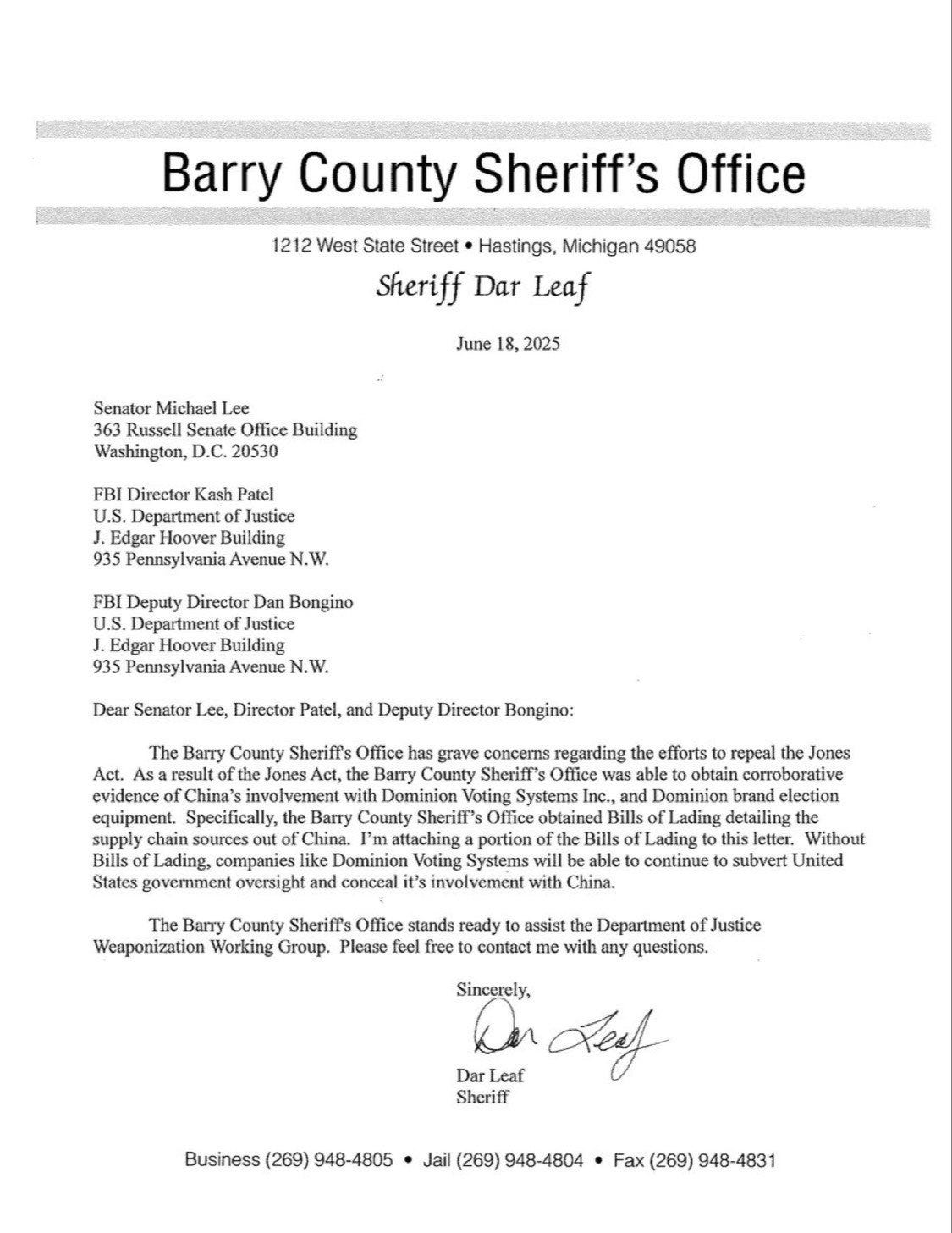 Sheriff Leaf has sent many letters to Jim Jordan, Kristi Noem, Kash Patel, et al describing the incriminating evidence of foreign interference and compromised election systems he has uncovered. You can find them on his X page.