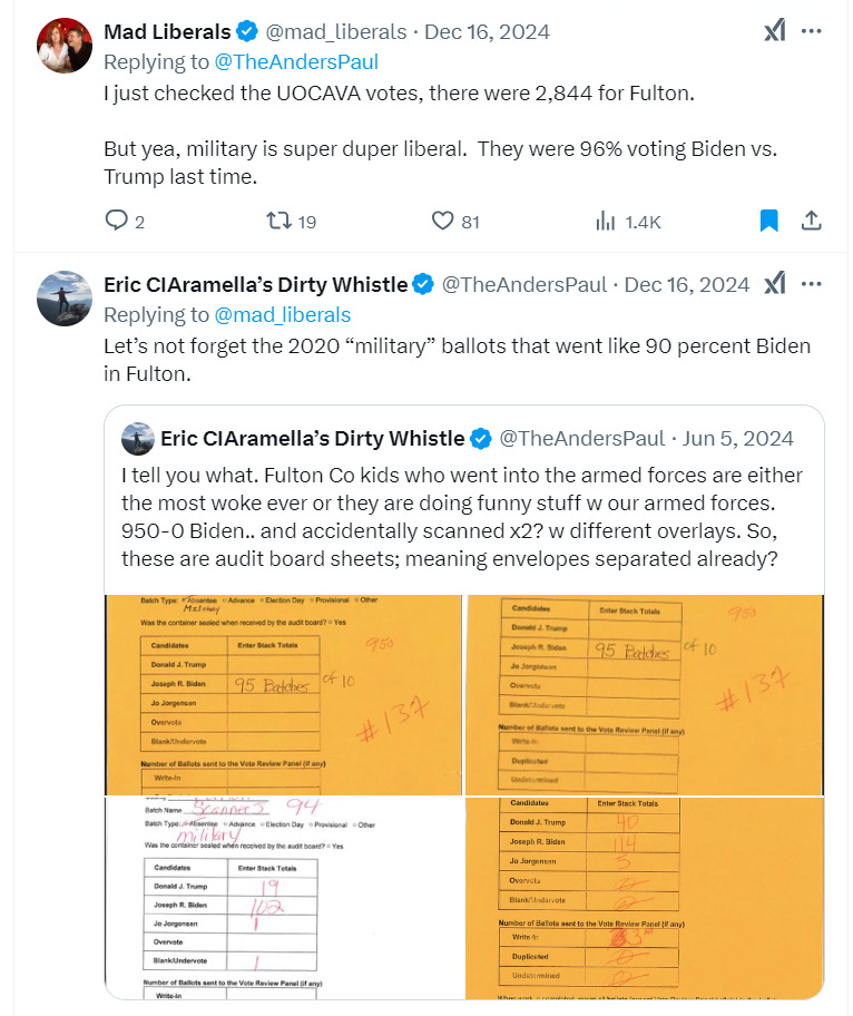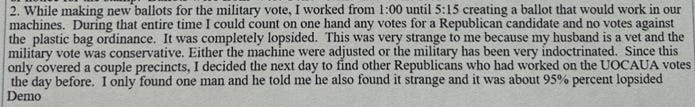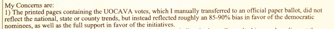 There were also resolution board members who noticed while transcribing the votes onto optical scan ballots that the UOCAVA ballots were 90% for the democrats, who have attested to this in a sworn, notarized affidavit. That’s a lot of eye witnesses to this phenomenon.