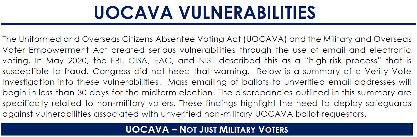 UOCAVA are the Uniformed and Overseas Citizens Absentee Voting Act ballots. This law was originally designed so military service members could cast their ballot and it would be returned in time to count in the election. Just like everything else, a good thing has been used for bad things, and this is no different.