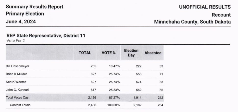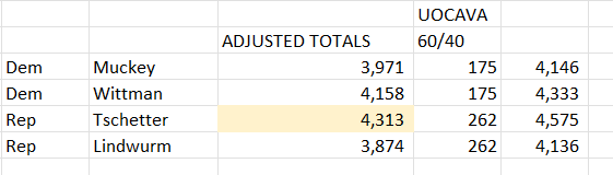 If we remove 393 unreliable votes for Muckey and Wittman, and 44 from Tschetter and Lindwurm, Tschetter comes out on top, followed by Wittman, and Muckey is the third place finisher.