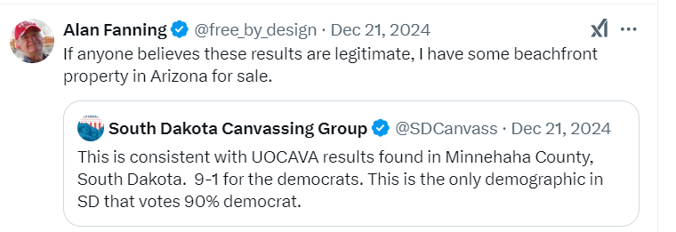 You may also remember that the analysis of the 2020 CVR’s in Minnehaha County revealed the UOCAVA ballots were very heavily in favor of Biden, and deviated from all other vote returns.