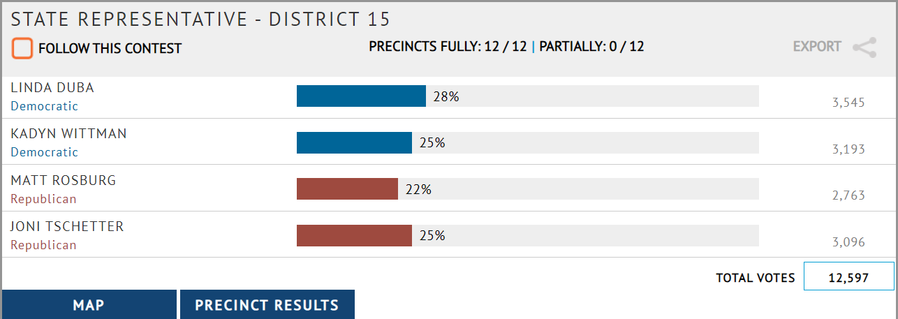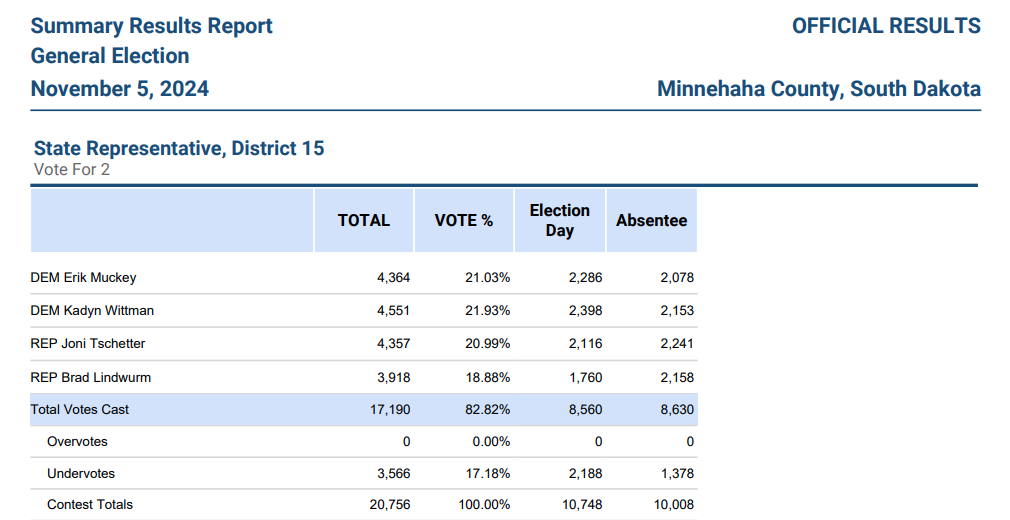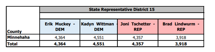 According to the official results, Kadyn Wittman (D) came in with the most votes, followed by Erik Muckey (D) in second, and Joni Tschetter (R) narrowly edged out by SEVEN VOTES.
