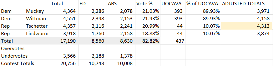 Now if we add back in 437 ballots at the approximate 60% R / 40% D rate like the rest of the absentee voters in precincts 4-16 and 5-16 voted, Joni Tschetter would have been the top vote getter by 242 votes and beat out Erik Muckey by 429 votes.