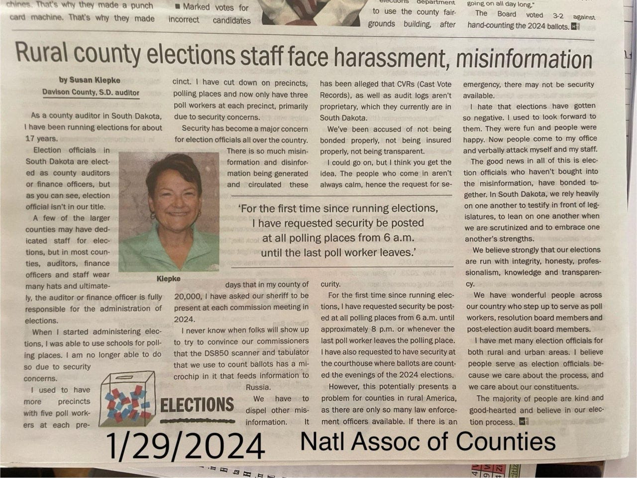 Davison County Auditor Susan Keipke was an overnight sensation when her propaganda piece in a NACO newsletter hit the local fake news media. Susan stressed how harassed she feels when people come to the commission meeting to air their distrust of the machines. She feels so threatened that she has requested law enforcement at every commission meeting and every polling place this year. Susan is a good student of the deep state, unconstitutional, weaponized federal agency rhetoric she learns in SDACO and NACO meetings, along with DHS/CISA/ES&S/Bpro messaging in auditor training sessions in Pierre.