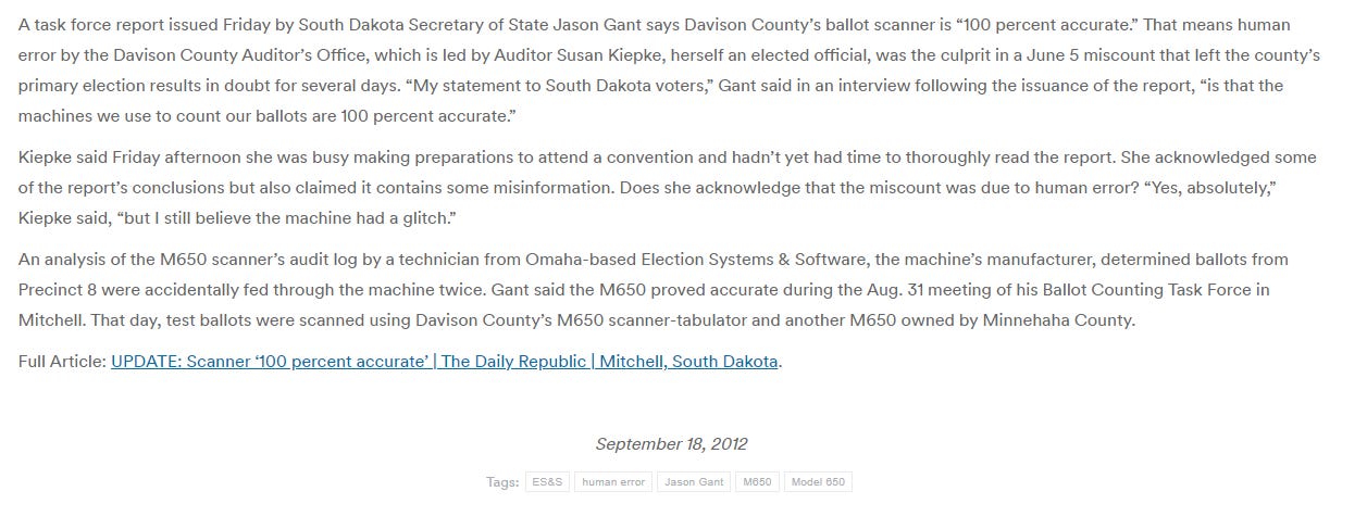One interesting tidbit from 2012. Susan was convinced the ES&S tabulators in her county were at fault for a counting error in a Davison Co election. Jason Gant threw her under the bus, while Susan claimed “I still believe the machine had a glitch.”