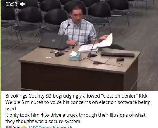 Rick Weible blew away any claims of election security in four minutes at the 3-19-24 Brookings County Commission meeting. This video is now going viral. Click the image below: