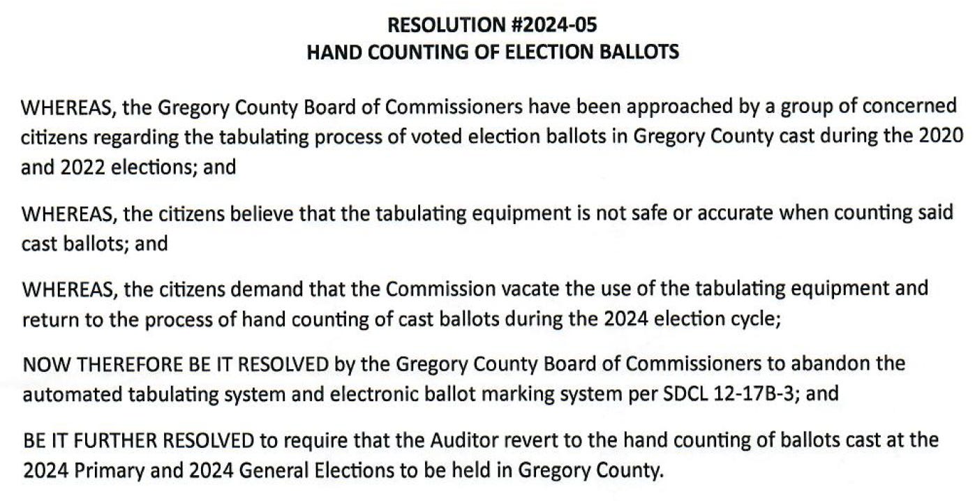 Locally, Gregory County Commission rescinded their 4-1 vote to hand count the 2024 elections. The 3-20-24 agenda listed a resolution that read like this: