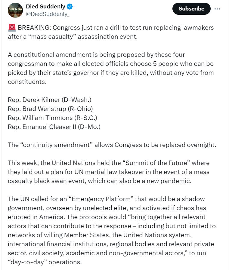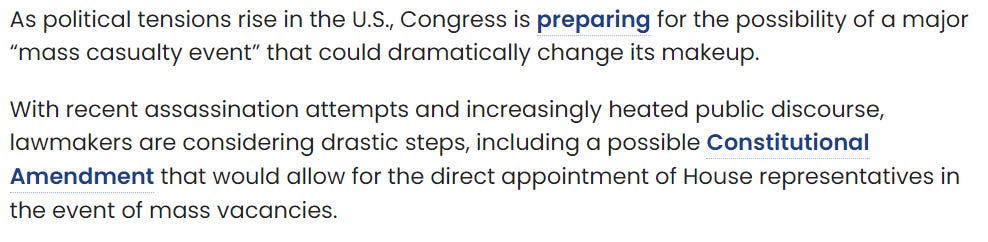 Meanwhile a bill has been introduced in Congress which would allow for the appointment of representatives in the case of a mass casualty event. What do they know and what are they preparing for? From the Gateway Pundit: