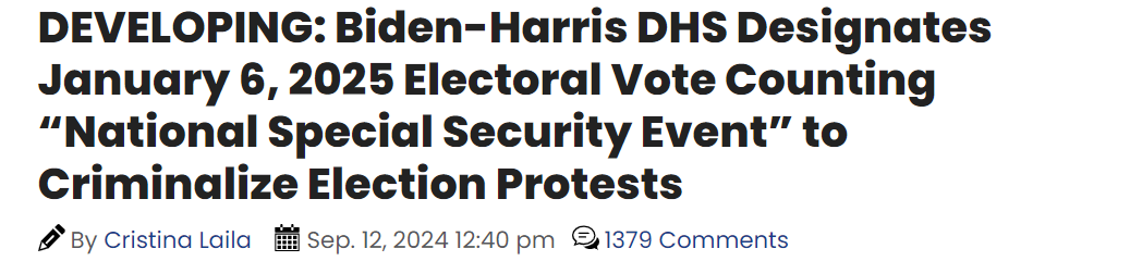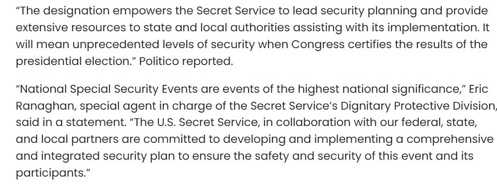 Also, did you know Merrick Garland’s DHS designated January 6, the day that Congress certifies the election, as a special security event empowering the secret service to lead security planning? Yes, the same secret service that can’t provide adequate security for Trump and is covering up two, possibly three recent assassination attempts, that we know of.